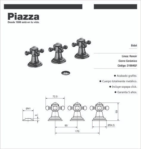 Griferia Bidet con transferencia Piazza Renoir 21904gf Acabado Grafito En tus actividades del dia a dia usa productos resistentes y funcionales. La griferia de baño Piazza 21904GF esta diseñada para adaptarse a cualquier espacio con personalidad y desarrollar con eficacia tareas como el lavado y la limpieza. Es doble comando, ya que posee una via para el agua caliente y otra para el agua fria, que funcionan de manera independiente. Esto te permitirá alcanzar la temperatura deseada de forma rápida y sencilla. SANITARIOS BRONCESUR ZONA LANUS OESTE